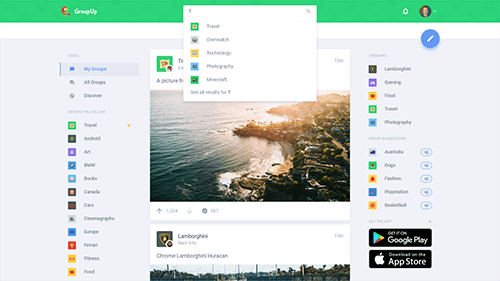 By following other users and groups, the user created their own personalized feed of posts. Users were also able to create their own posts and upload photos, while giving them full control over who gets to see the post.