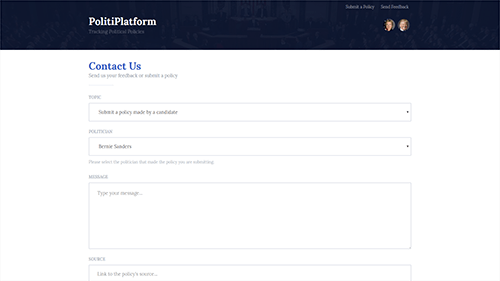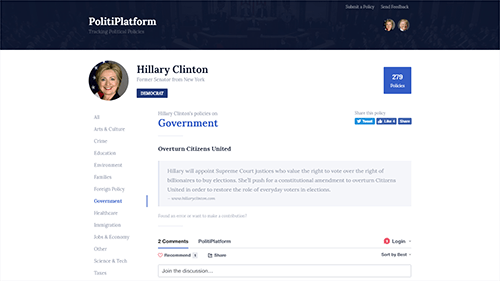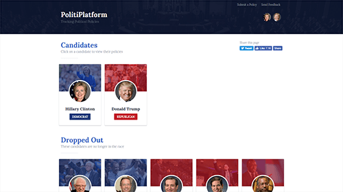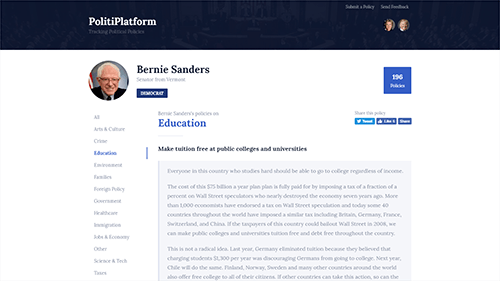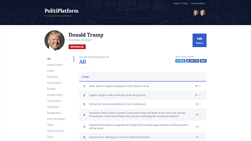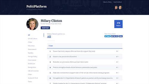 PolitiPlatform tracked and listed the many hundreds of policies of each presidential candidate. The goal was to better inform voters by making it easier to read, understand, and compare the policies between candidates.